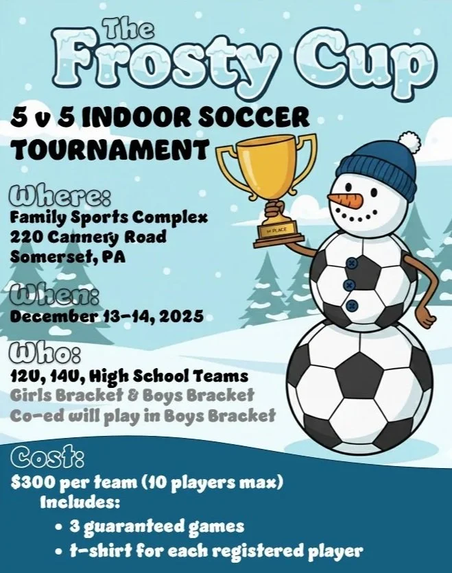 Grab you team and join us for some fun at the Frosty Cup 5v5 Indoor Soccer Tournament on December 13th and 14th, 2025.